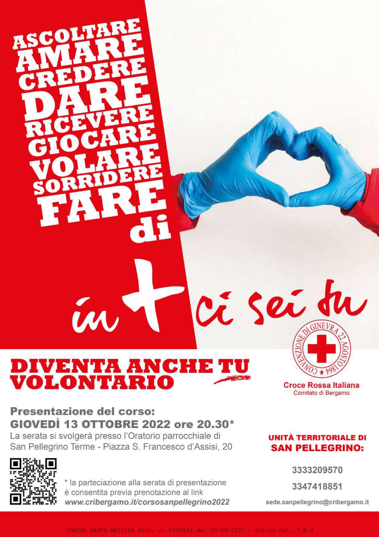 La sede di San Pellegrino Terme di Croce Rossa Italiana, ha in programma, con presentazione il 13 ottobre p.v., un nuovo corso per volontari. Il corso consentirà agli interessati di entrare a far parte dell'associazione ed eventualmente di intraprendere, successivamente, il corso di 120 ore per diventare soccorritore 112.